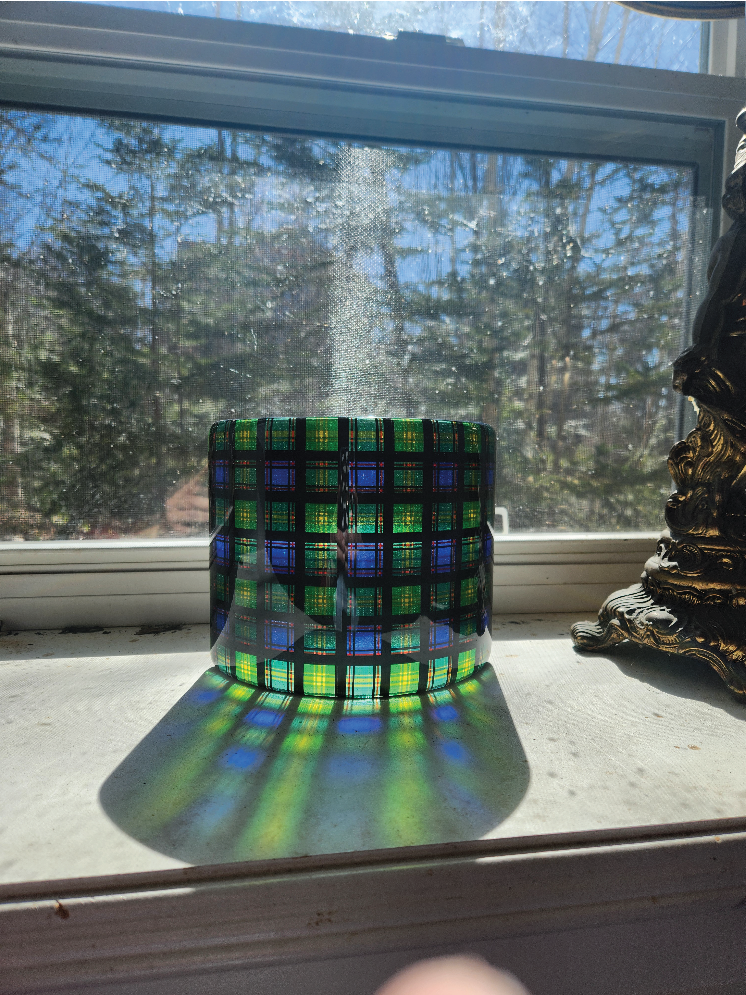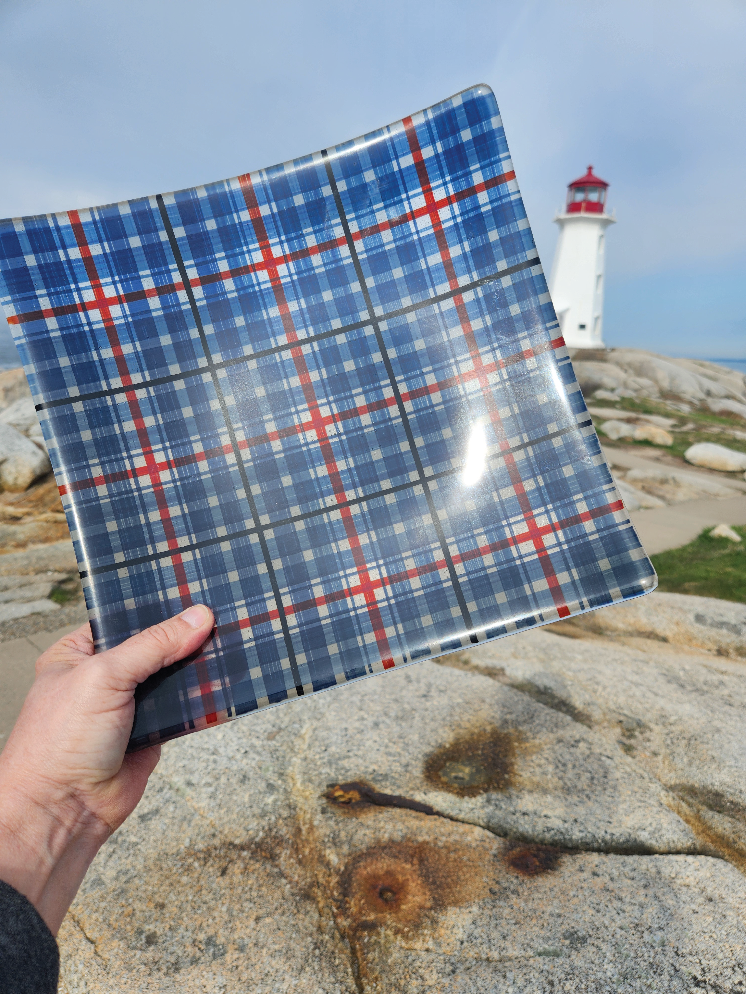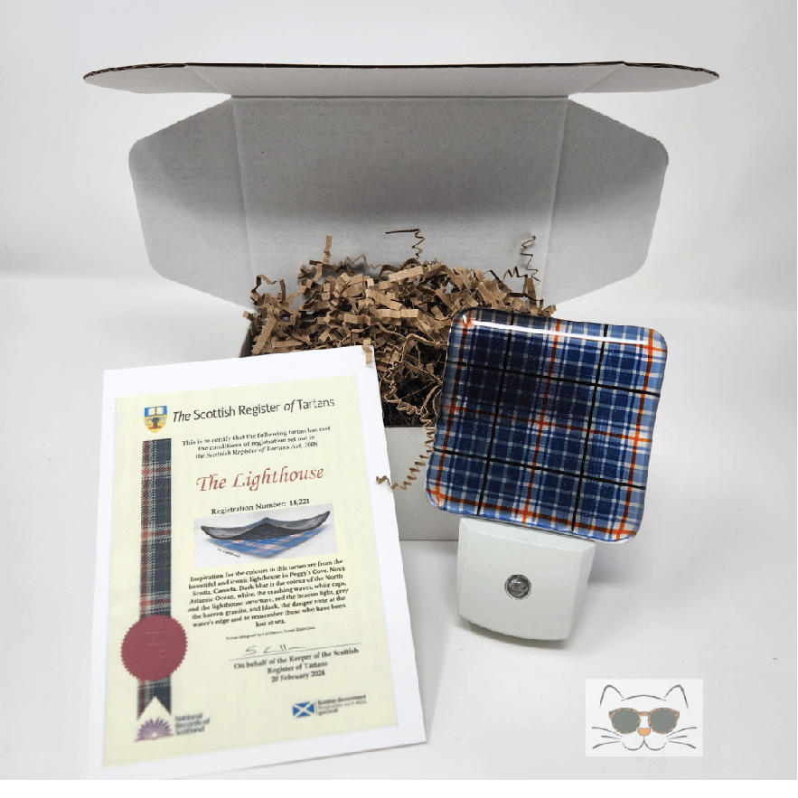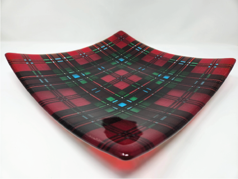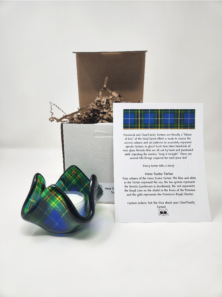 Clan/Family Tartans are literally a “labour of love” of the Diva! Great effort is made to source the correct colours and set patterns proportionally to accurately represent specific tartans in glass! Each item takes hundreds of 1mm glass threads that are all cut and positioned by hand. There are several kiln firings required for each piece too!